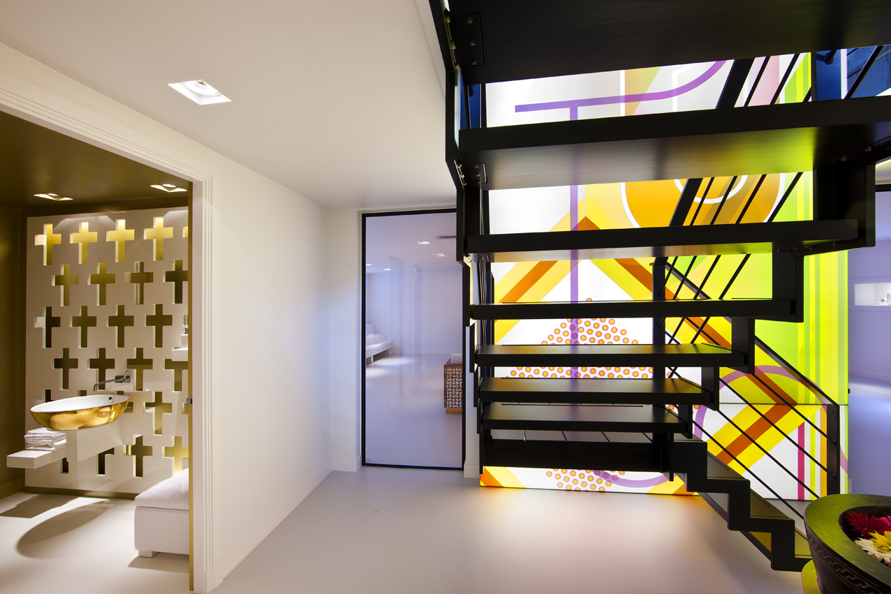 Verscholen tussen de moderne appartementen met strakke lijnen en metalen sierroosters is de kapel een opvallende verschijning. Vanaf het moment dat de deur opengaat, wanen we ons in een compleet andere wereld. De moderne centrale hal met trappenhuis wordt verlicht door een drie etages tellende lichtwand met een abstracte beeltenis van Maria en het kindje Jezus. We volgen een vriendelijke dame de trap op, langs een gorilla met baby van kogelhulzen en het massieve altaar, richting de kapel.